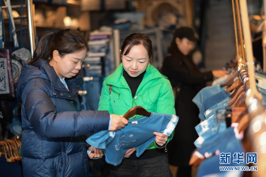 12月1日,在丹寨县万达小镇欧报浪蜡染体验馆,游客在选购蜡染服装。