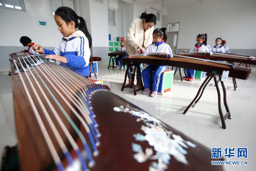 12月1日,山东省青岛市即墨区龙山中心小学古筝社团的学生在老师的指导下弹奏古筝。
