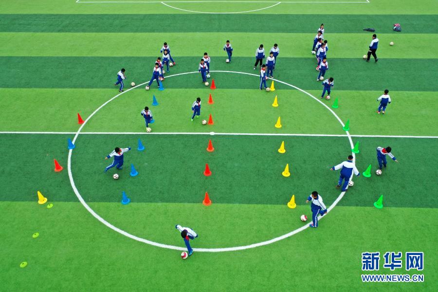 12月1日,山东省青岛市即墨区龙山中心小学足球社团的学生在操场上训练(无人机照片)。