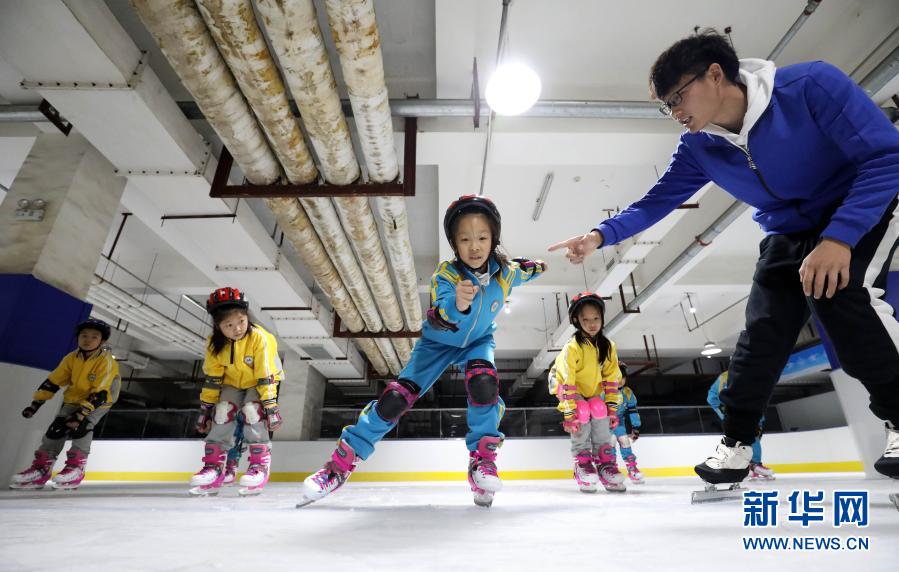 11月30日,在河北省石家庄市新华区滑冰馆,教练正在教授学生们滑冰动作。