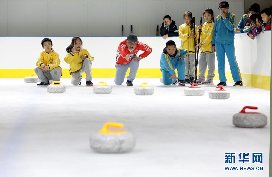 11月30日,在河北省石家庄市新华区滑冰馆,学生们在教练(左三)指导下体验冰壶运动。