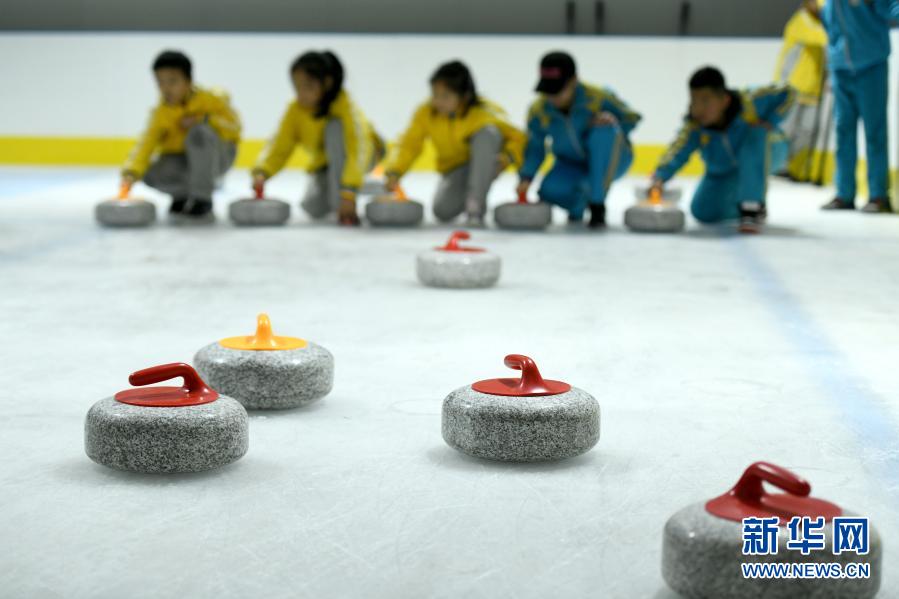 11月30日,在河北省石家庄市新华区滑冰馆,学生们在体验冰壶运动。