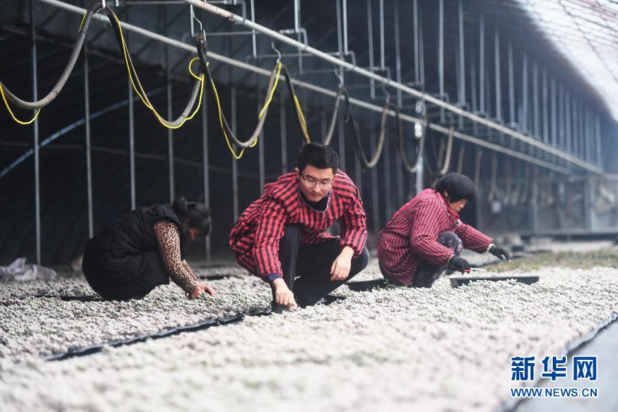 12月2日,张晓东和工人在“多肉花园”打理多肉苗。