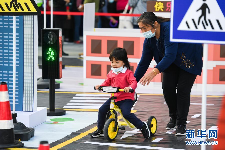 12月2日,一名小朋友在深圳南山文体中心广场开展的“全国交通安全日”主题活动上参与模拟城市交通现场的游戏。