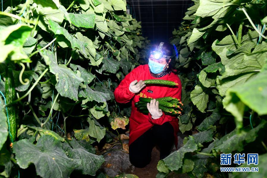在寿光市绿圣果蔬专业合作社,菜农桑雪梅带着头灯采摘黄瓜(2月2日摄)。新华社记者 郭绪雷 摄