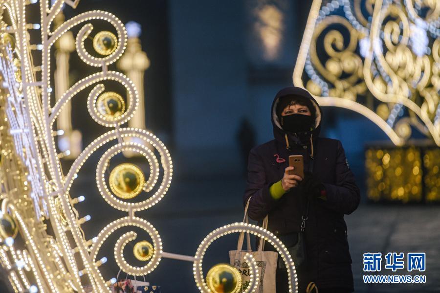这是12月4日在俄罗斯首都莫斯科拍摄的一名戴口罩的行人。
