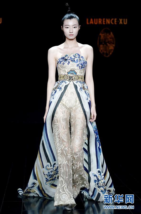 12月5日,模特在展示高级定制时装设计师劳伦斯·许设计的时装。 当日,在济南举行的第二届“泉城风尚”国际时装周上,高级定制时装设计师劳伦斯·许带来一场以故宫为设计源泉的新国风华服秀。 新华社记者 陈建力 摄