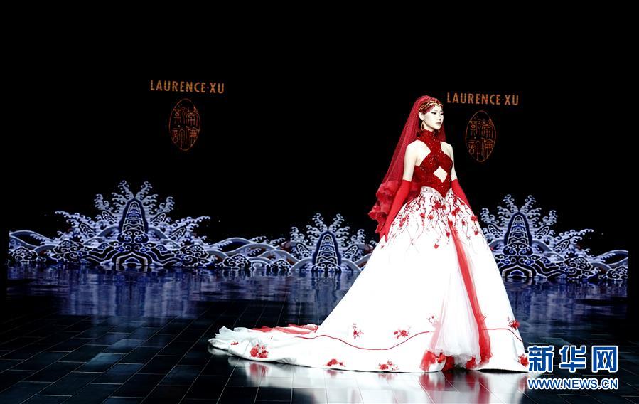 12月5日,模特在展示高级定制时装设计师劳伦斯·许设计的时装。 当日,在济南举行的第二届“泉城风尚”国际时装周上,高级定制时装设计师劳伦斯·许带来一场以故宫为设计源泉的新国风华服秀。 新华社记者 陈建力 摄