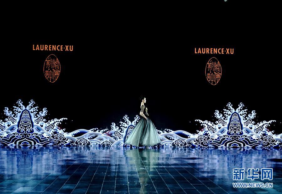 12月5日,模特在展示高级定制时装设计师劳伦斯·许设计的时装。 当日,在济南举行的第二届“泉城风尚”国际时装周上,高级定制时装设计师劳伦斯·许带来一场以故宫为设计源泉的新国风华服秀。 新华社记者 陈建力 摄