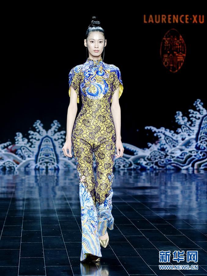 12月5日,模特在展示高级定制时装设计师劳伦斯·许设计的时装。 当日,在济南举行的第二届“泉城风尚”国际时装周上,高级定制时装设计师劳伦斯·许带来一场以故宫为设计源泉的新国风华服秀。 新华社记者 陈建力 摄