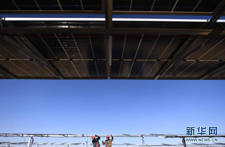 12月15日,在青海省海南藏族自治州共和县中国大唐集团有限公司30万千瓦竞价光伏项目现场,工人在进行安装作业。