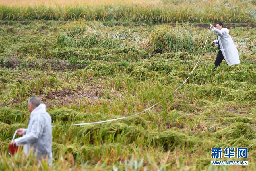 11月2日,湖南省衡阳市衡南县清竹村,由“杂交水稻之父”袁隆平团队研发的杂交水稻双季亩产突破1500公斤大关,其中晚稻品种为第三代杂交水稻。在第三代杂交水稻“叁优一号”衡南试验示范基地一块被抽取测产的示范田里,工作人员在测量示范田面积(11月2日摄)。