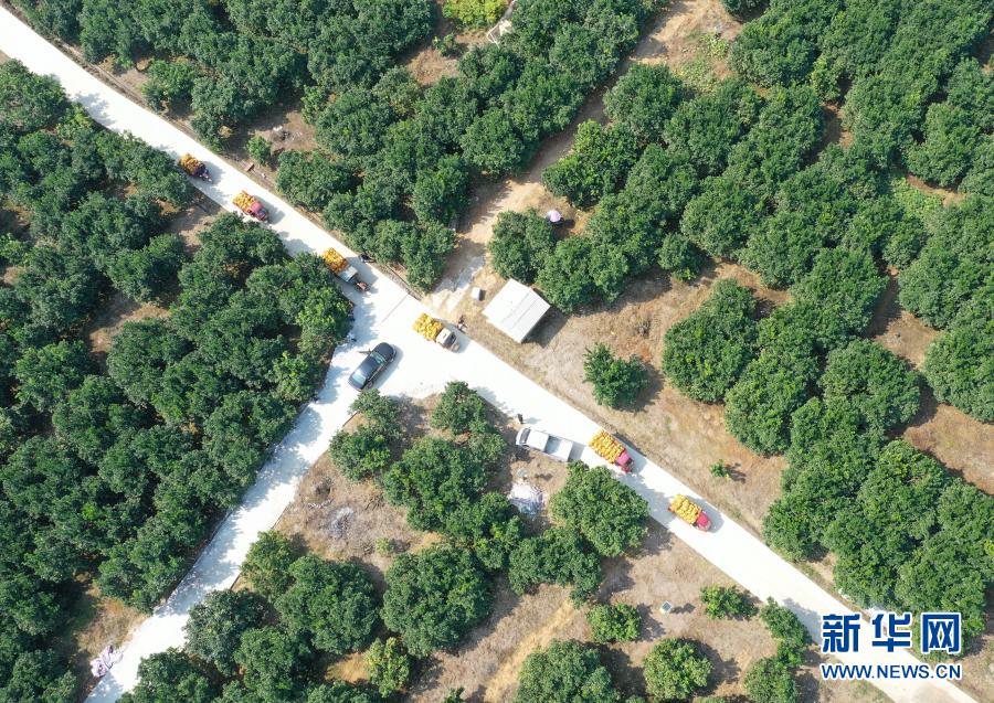 在广西罗城仫佬族自治县金玉柚生态产业扶贫示范区,装载柚子的车辆在柚子园内行驶(无人机照片,2019年11月5日摄)。