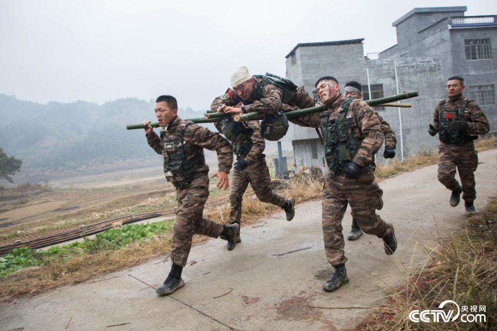 特战队员进行简易担架搬运伤员。