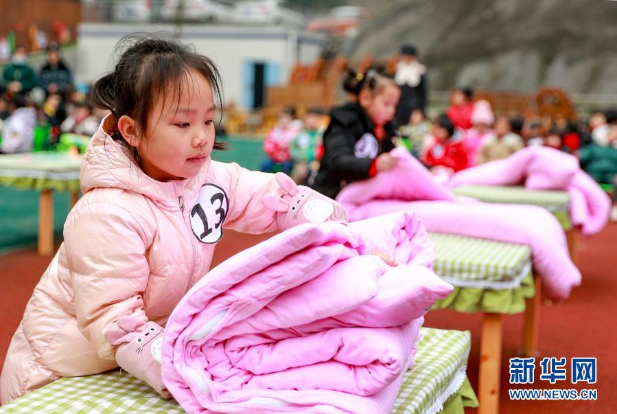 12月21日,四川省华蓥市清溪路幼儿园的小朋友在参加叠被子比赛。