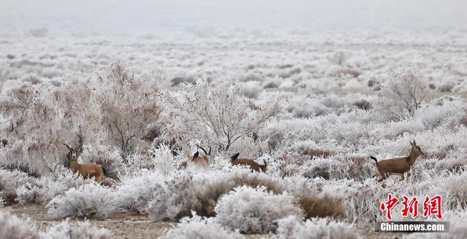 入冬以来,新疆博湖县普降瑞雪,出现雾淞奇观,成群结队的鹅喉羚在博斯腾湖南岸戈壁滩上觅食,成为当地一道靓丽的风景。鹅喉羚是国家二级保护动物,属典型的荒漠、半荒漠区域生存的动物。近年来,随着博斯腾湖生态环境的不断改善和民众保护野生动植物意识的不断提高,引来各类动物到博斯腾湖湿地栖息、繁衍。颜明星 摄