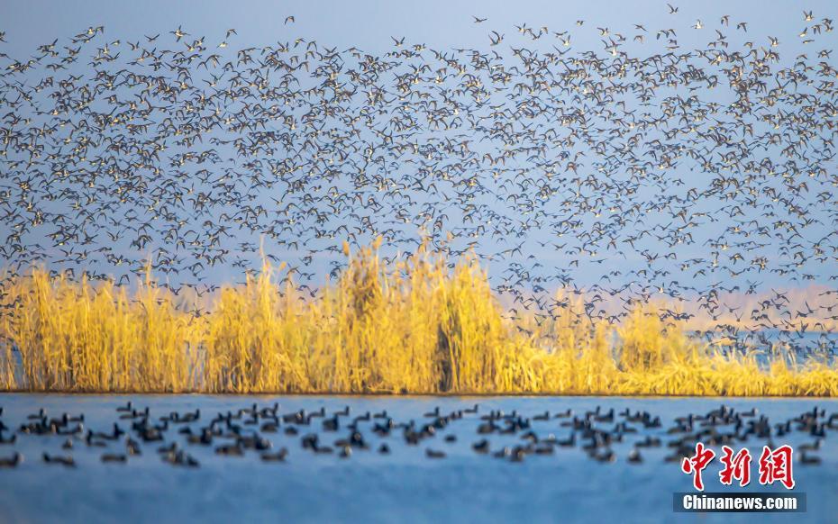 12月22日,江苏省宿迁市泗洪县,百万只候鸟云集洪泽湖湿地。洪泽湖湿地是国家级自然保护区,总面积达75万亩,是华东地区最大的淡水湿地,这里水质优良、草木繁茂、水产丰富,是候鸟迁徙途中的重要驿站,每年10月都有大批候鸟来此越冬,次年3月才逐渐离去。近年来,该县不断加大环境保护与修复力度,加上人们爱鸟、护鸟意识逐步增强,鸟类数量逐年增多,种群数也增加到206种。 中新社发 张连华 摄