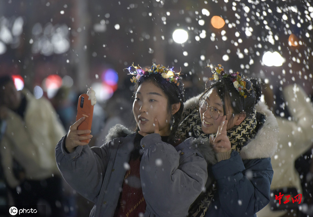2020年12月24日,江苏省淮安市,一商家在广场营造的“漫天飞雪”场景让购物和游玩的市民感受到浓浓的新年氛围。当日是平安夜,“雪花飞舞”的夜色仿佛让人们进入一个童话般的浪漫世界。(贺敬华/IC photo)