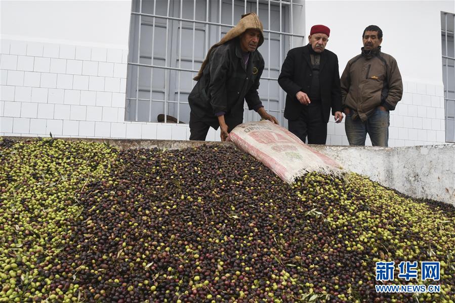 12月26日,在突尼斯迈努拜省一个橄榄油作坊,人们查看橄榄。 突尼斯是全球主要的橄榄油生产国和出口国之一。 新华社发(阿代尔 摄)