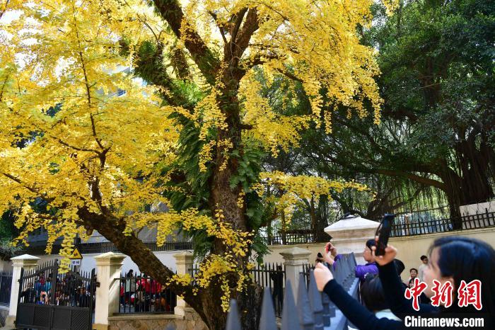 图为市民和游客在古银杏树下拍照。 张斌 摄