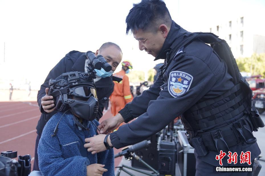 12月27日,在《中华人民共和国反恐怖主义法》颁布实施五周年之际,云南省“反恐怖宣传教育进校园”系列活动启动仪式在昆明举行,并在现场进行反恐处置、救护救援、应急疏散等演练,同时展示多种反恐装备。图为在装备展示区,一名小男孩体验特警的头盔。中新社记者 刘冉阳 摄