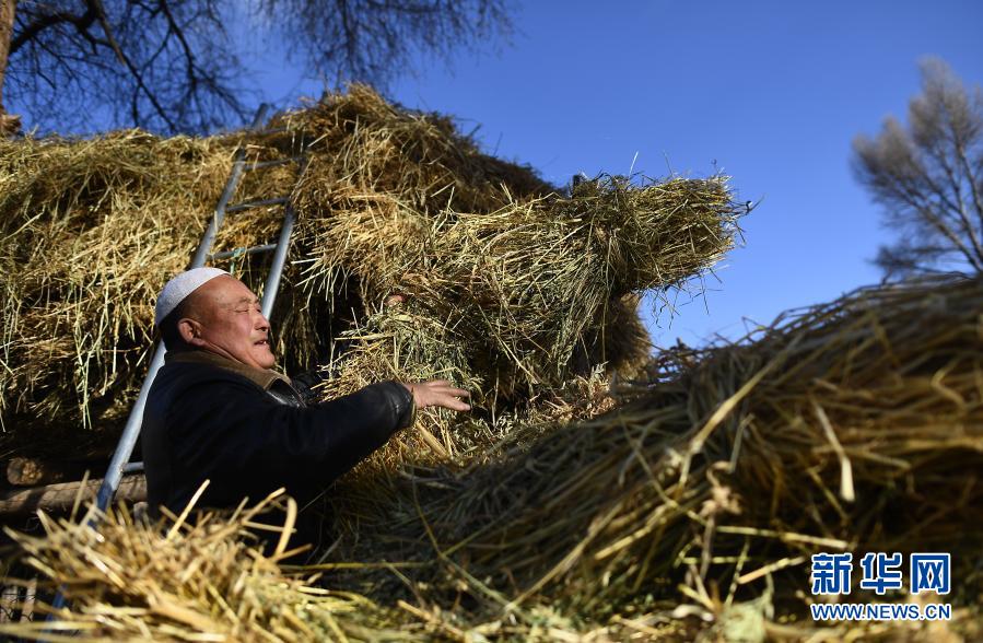 赵学文在自家羊圈内准备草料(12月9日摄)。新华社记者 张宏祥 摄