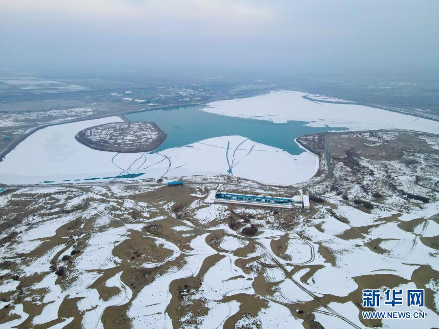 这是12月27日拍摄的塔克拉玛干沙漠中的达瓦昆湖(无人机照片)。在新疆岳普湖县达瓦昆沙漠旅游风景区内,塔克拉玛干沙漠在皑皑白雪映衬下更添秀色,黄沙与白雪相映成趣,景色如画。 新华社记者 高晗 摄
