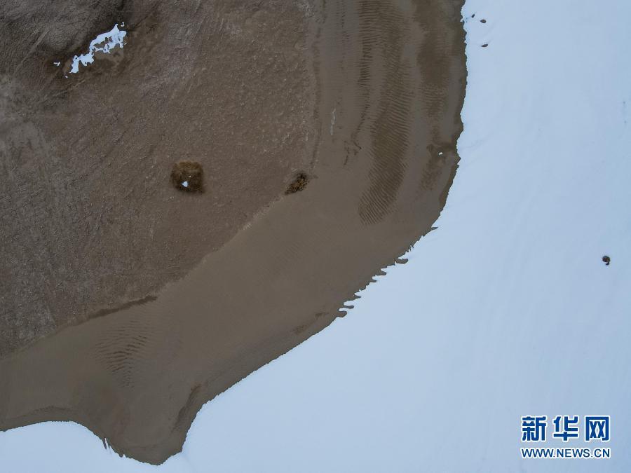 这是白雪映衬下的塔克拉玛干沙漠(无人机照片,12月27日摄)。在新疆岳普湖县达瓦昆沙漠旅游风景区内,塔克拉玛干沙漠在皑皑白雪映衬下更添秀色,黄沙与白雪相映成趣,景色如画。 新华社记者 高晗 摄
