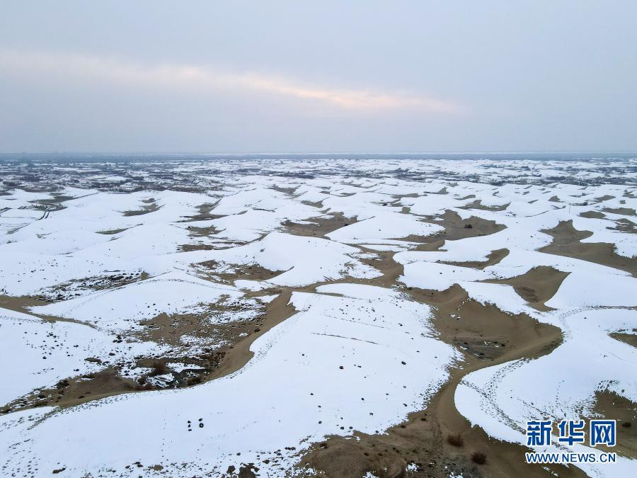 这是12月27日拍摄的塔克拉玛干沙漠(无人机照片)。在新疆岳普湖县达瓦昆沙漠旅游风景区内,塔克拉玛干沙漠在皑皑白雪映衬下更添秀色,黄沙与白雪相映成趣,景色如画。 新华社记者 高晗 摄