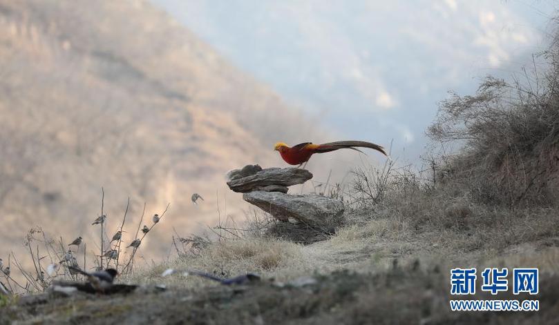 一只红腹锦鸡与松鼠“偶遇”。新华网 发(兰立强 摄)