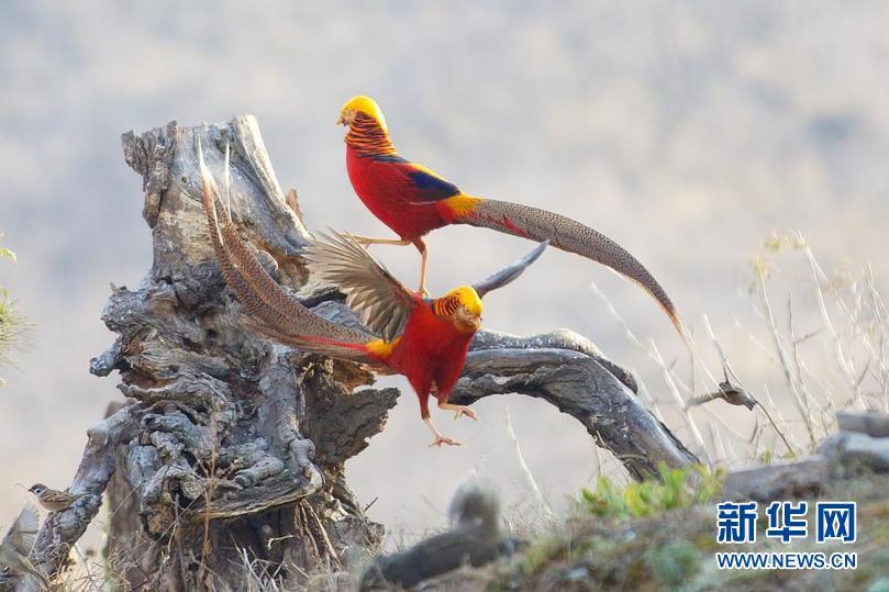红腹锦鸡时而静立,时而飞舞,姿态十分灵动。新华网 发(兰立强 摄)