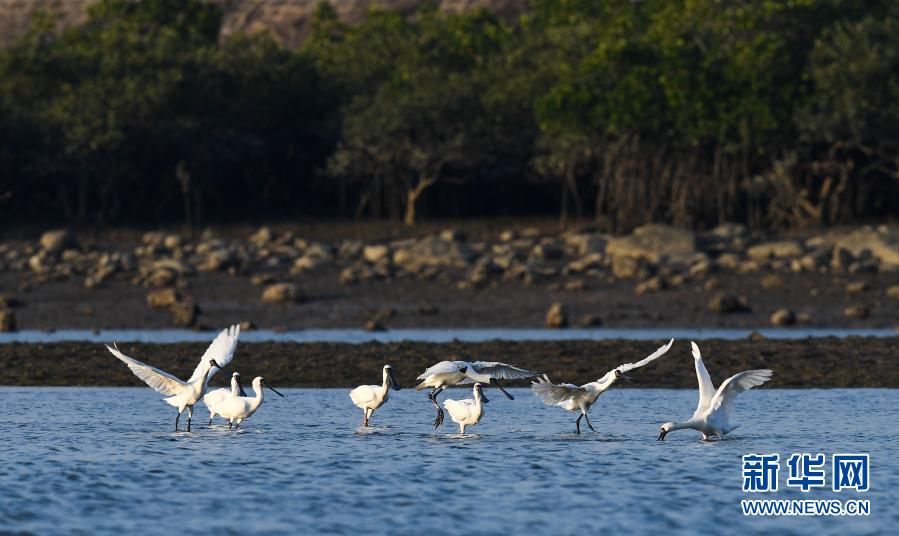 近日,不少黑脸琵鹭飞临位于海南儋州市光村镇的海南新盈红树林国家湿地公园越冬。黑脸琵鹭在湿地公园飞翔、嬉戏,成为冬日里一道独特风景。