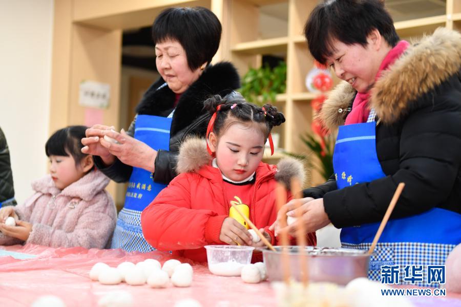 12月29日,湖州南浔区南浔镇横街村老人与幼儿园小朋友一起制作汤圆。新华社记者 黄宗治 摄