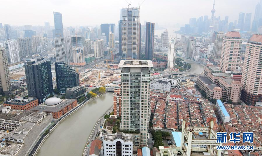 12月29日,从空中俯瞰苏州河从城市楼群中穿过(无人机照片)。新华社记者 方喆 摄