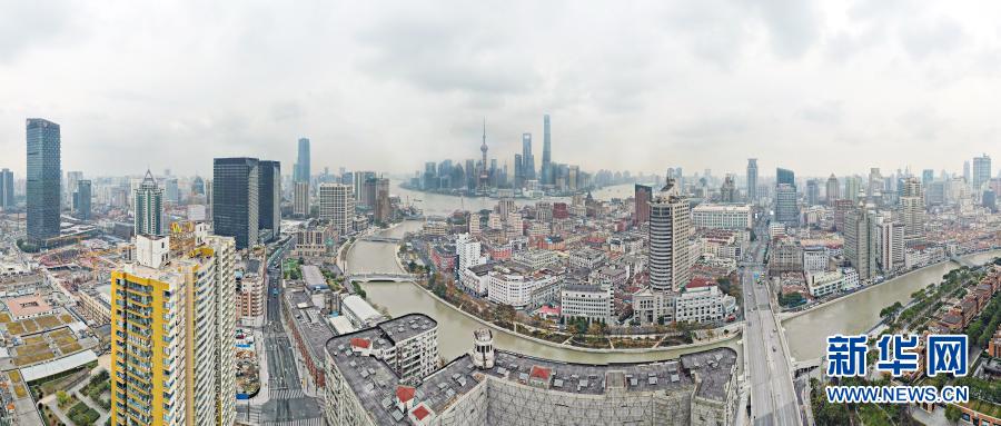 12月29日,从空中俯瞰苏州河(下)从城市楼群中穿过(无人机全景照片)。新华社记者 方喆 摄