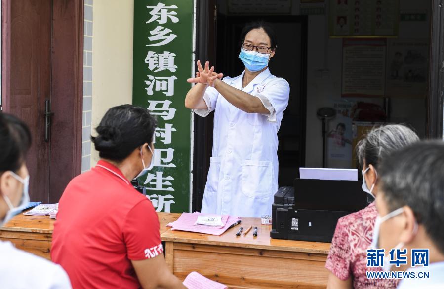 乡村医生江凤英(中)给广西武宣县东乡镇河马村村民讲解科学的洗手方法(6月20日摄)。新华社记者 曹祎铭 摄