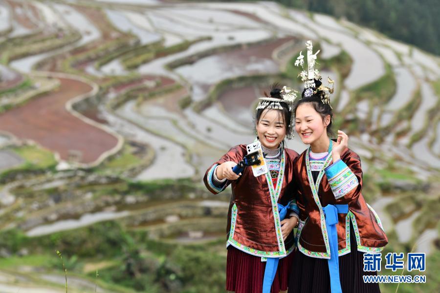在贵州省从江县加榜乡加车村,脱贫攻坚指挥所网格员吴贤艳(左)与村里的大一女生梁琼英在直播推介加榜梯田风光(4月19日摄)。新华社记者 杨文斌 摄