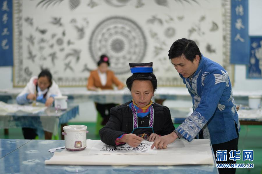 在贵州省丹寨县金泉街道千年传蜡染制作坊,创办人之一的王方周(右一)指导易地扶贫搬迁群众创作蜡画(12月1日摄)。新华社记者 杨楹 摄