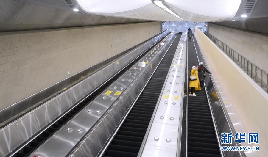 旅客乘京张高铁北京八达岭长城站内长达80多米的升降滚梯出站(12月29日摄)。新华社记者 李欣 摄