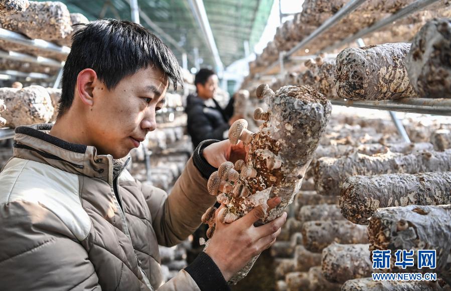 12月30日,洛南岭南生物科技扶贫开发有限公司员工在香菇大棚里为菌棒疏蕾。新华社记者陶明摄