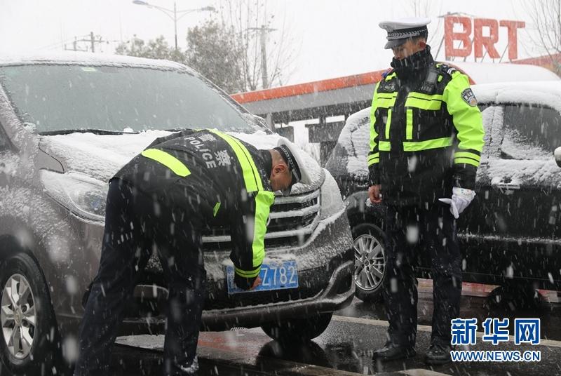 12月29日,在枣庄市高新区泰山路路口,高新区交警大队民警帮助等待红路灯车辆清理遮挡牌照积雪。