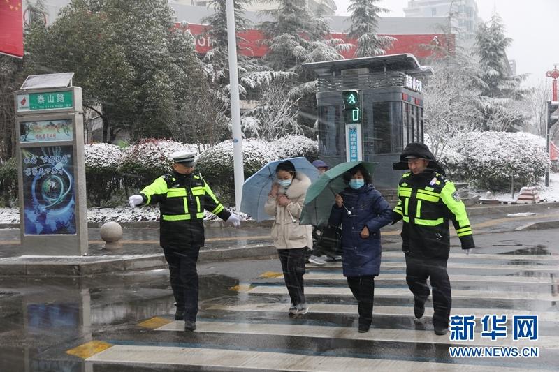 12月29日,在枣庄市高新区泰山路路口,高新区交警大队民警护送市民在结冰路面过马路。