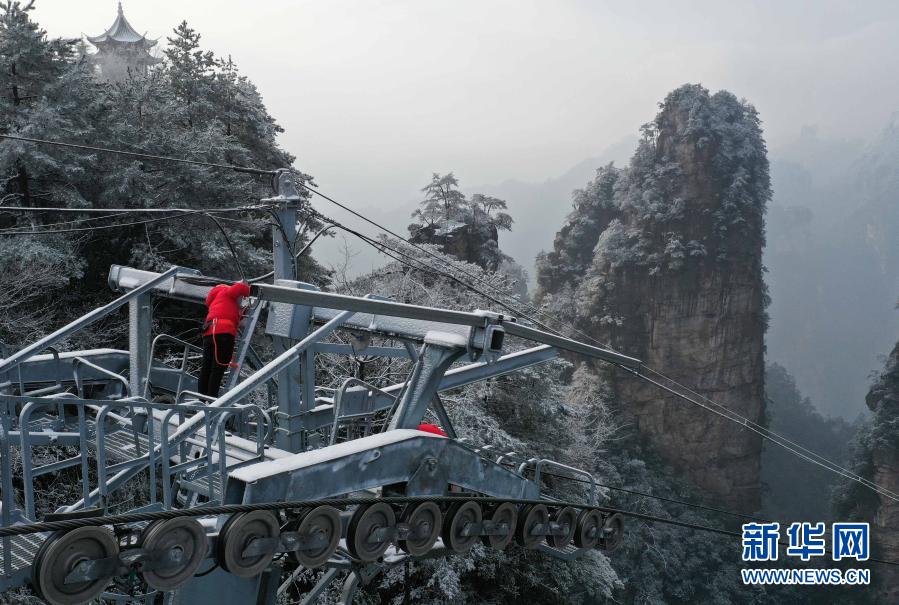 受寒潮影响,湖南张家界市武陵源区高海拔山区出现低温降雪天气。当地景区管理部门采取多种措施做好防范应对工作,加强对高空索道等游览设施的安全检查和维护,排除因低温冰雪天气带来的安全隐患,确保游客安全。