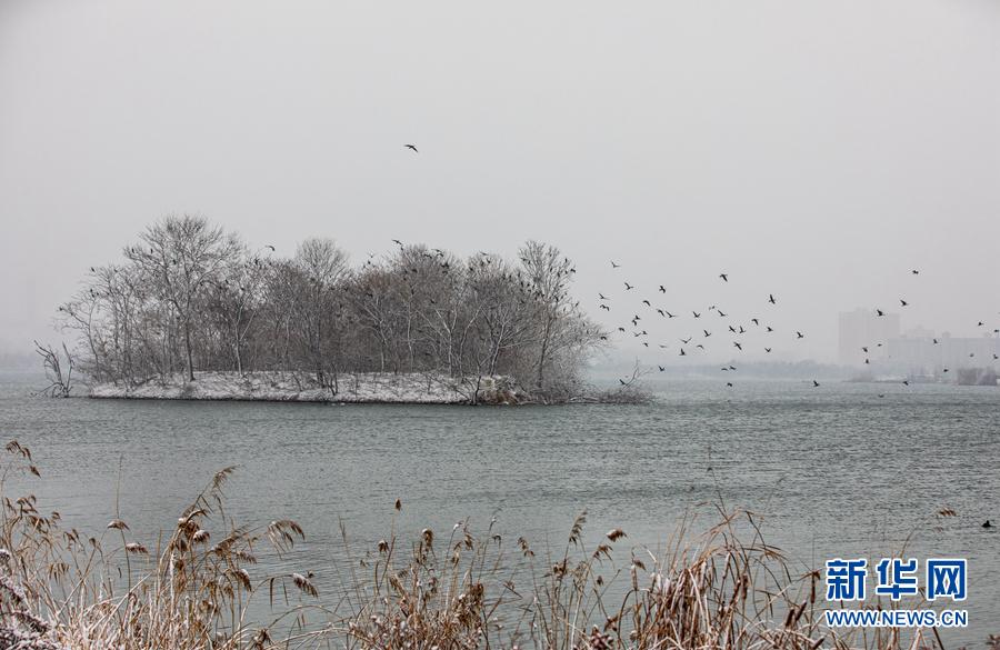 12月29日,在安徽省淮北市烈山区南湖生态公园航拍的雪景。