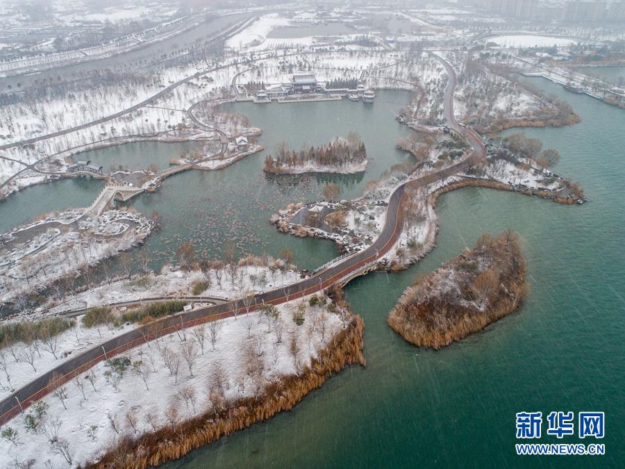 12月29日,在安徽省淮北市烈山区南湖生态公园航拍的雪景。