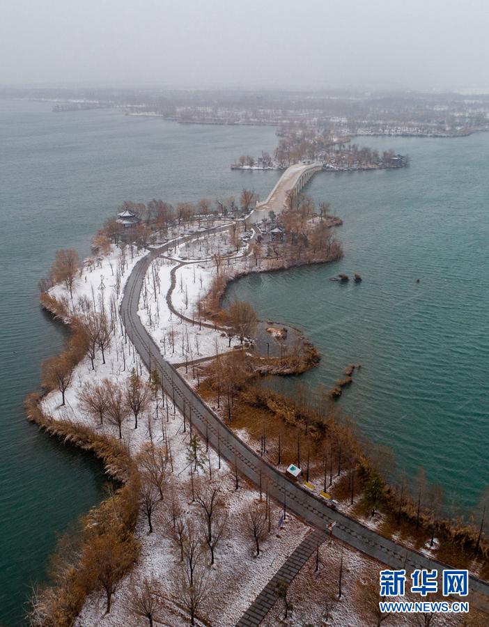 12月29日,在安徽省淮北市烈山区南湖生态公园航拍的雪景。