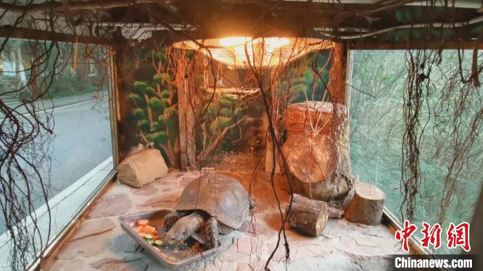 图为陆龟正在烤灯下进食。 王成杰 摄