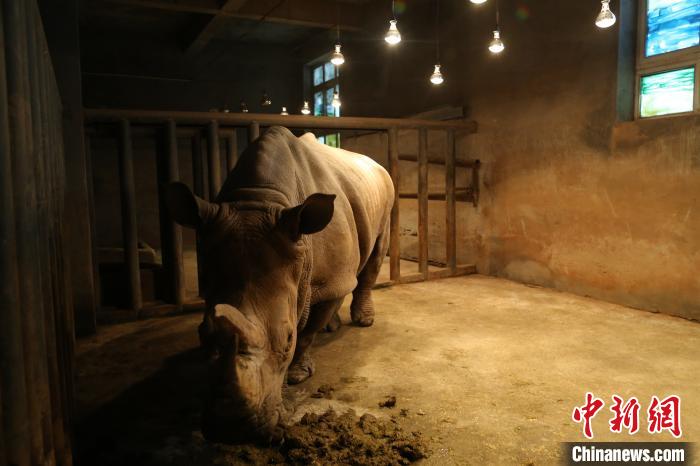 图为犀牛正在享受浴霸灯的温暖。 王成杰 摄