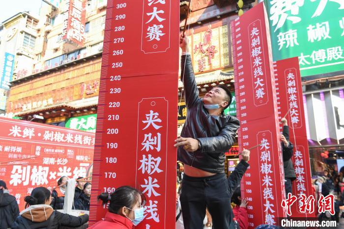 12月30日,一场趣味的夹剁椒米线大赛在长沙黄兴路举行,参赛选手们想出各种“增高”办法夹起米线比拼高度,从而争夺冠军。