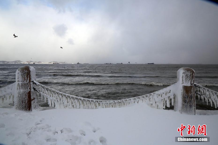 涌上海岸的海浪结冰,形成了大面积冰凌奇观。 王娇妮 摄